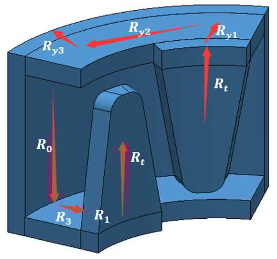 From the magnetic circuit cloud diagram of the finite element simulation in Figure 4, we can confirm that the magnetic flux of the micro permanent magnet claw-pole stepper motor starts from the permanent magnet rotor, flows into the claw-pole through the air gap, then flows into the yoke along the tooth axis, and then flows into the yoke along the tooth axis. It flows into the housing along the yoke, flows out along the other claw pole, and finally returns to the rotor to form a loop. Figure 5 is a schematic diagram of the magnetic flux path. The equivalent magnetic circuit model established by the magnetic flux of the motor based on the equivalent magnetic circuit theory is presented in Figure 6. Table 2 substitutes a different expression for each value of the miniature permanent magnet claw-pole stepper motor, and then uses these reluctances, the flux of the permanent magnet flux, and the flux of the stator side-wound windings to calculate. Hence, we get the desired magnetic flux density in the stator-rotor air gap. The accuracy of the equivalent magnetic circuit model depends on the accuracy of each reluctance calculation []. Most scholars will calculate the individual magnetoresistances based on the measured parameters. However, for the micro claw-pole stepper motor studied in this paper, the volume size is too small and the measurement error is large, which directly leads to the low accuracy of the reluctance calculation. In addition, due to the small size of the motor, the local magnetic circuit is saturated, which further increases the calculation error. Although the accuracy of calculating the value of each magnetoresistance through finite element simulation is high, it takes a lot of time to solve. Therefore, this paper uses the finite element method to correct the reluctance calculation of the studied motor, and then brings these relatively accurate values into the analytical formula to improve the accuracy of the equivalent magnetic circuit model. On the one hand, the time cost is greatly reduced, and on the other hand, the accuracy of the built model is improved.