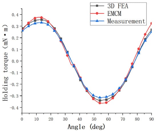 In order to further verify the accuracy of the established model, the actual measurement of the holding torque of the motor studied in this paper is carried out. Moreover, the results obtained with EMCM calculation value and 3D FEA simulation are verified and compared. As shown in Figure 8, the actual measured maximum holding torque of this motor is 0.32 mN·m. The difference from the finite element simulation value is 0.021 mN·m, and the difference from the EMCM calculation value is 0.05 mN·m. The measured value is smaller than the simulated and calculated values. Considering the existence of friction in the actual measurement and the influence of the accuracy of the spring balance, it can be considered that the method in this paper is accurate. The calculated values are in good agreement with the experimental results.