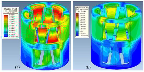 (a) Magnetic density cloud map under 0.10 mm air gap (left); (b) Magnetic density cloud map under 0.30 mm air gap (right).