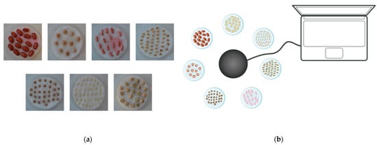 A total number of 40 rice seeds, 40 wheat seeds, 20 pea seeds, 10 seeds, 30 lentil seeds, 15 borlotto bean seeds and 15 green bean seeds were prepared. Each batch of seeds was placed on top of a cotton pad soaked with 40 mL of water inside a Petri dish (7 cm in diameter), as shown in Figure 1a. A duplicate Petri dish was prepared for each seed variety. Thus, the first seven represent samples treated with sound waves, and the other half are intended to be the control samples (not subject to the treatment with acoustic waves).