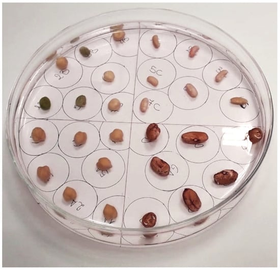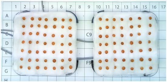 All of the operations were carried out under the hood using sterilized latex gloves. Three lab spoons of red lentils were collected and transferred to the graduated conical test tube with 30 mL of ethanol. The tube was stirred for two minutes, at the end of which the ethanol was discarded. Then, distilled water was added to the test tube, and a series of washes (about seven) was performed to eliminate ethanol residues to avoid seed damage. The seeds were then arranged in 7 rows of 7 seeds each for 49 red lentil seeds per plate (Figure 2).