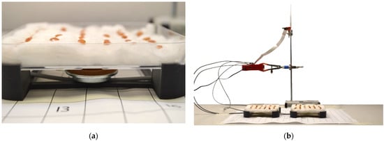 Arrangement of the plates on a plastic support in order to correctly expose the samples to the stimuli (a) and an overview of the experimental setup with the locations of all used devices (b).
