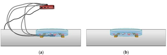Periodically, every thirty minutes, all of the seeds were taken from the water, dried thoroughly with absorbent paper and weighed again using an analytical laboratory balance, taking care to note the weights of the single seeds for each measure. The operation was repeated until all seeds had absorbed the maximum amount of water. Once the optimal soaking time had been established, two samples that were the same in terms of variety and number of seeds were prepared. An example includes: 16 pinto bean seeds, 16 chickpea seeds, 16 green bean seeds (type dwarf green mangiatutto) and 16 pea seeds. Preliminarily, the initial weights of the two samples’ seeds were measured with a laboratory analytical balance. Subsequently, as schematized in Figure 5a,b, both samples were immersed in water inside two different Petri dishes made of glass and placed in two different environments. One sample represented the control, while the other was the stimulated sample. Sound waves were transmitted by direct contact between the magneto dynamic transducer and the Petri dish containing the water and seeds. The sound treatment was continued for ninety minutes. At the same time, the seeds of the control sample were also immersed in water inside the second Petri dish; however, in this case, there was no stimulation.