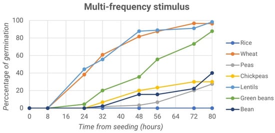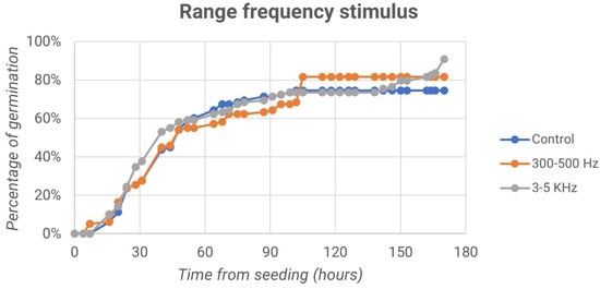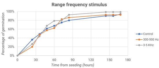 Finally, we report the trend of the germination percentage over time both for the control samples and for the samples treated with frequencies of 300–500 Hz and 3–5 kHz, as shown in the graphs in Figure 13.