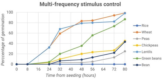 The first experiment evaluated the effects of high-frequency sound waves on germination. Different seed species were compared, considering treated and control samples. To better understand the behavior, the percentage of variation in germination was evaluated and compared among the different conditions. The germination trends over time of the treated samples of rice seeds, wheat, pea, chickpea, lentil, green bean and borlotto bean are reported in Figure 6.