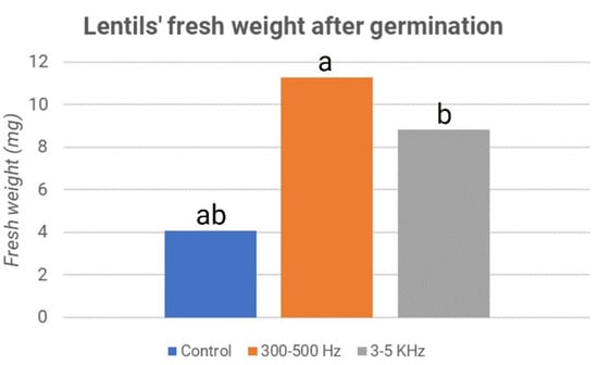 Lentils’ fresh weight after germination: third experiment. The letters “a” and “b” refer to the statistical significance of the observed difference between sample couples with a p-value < 0.05 and n = 160.