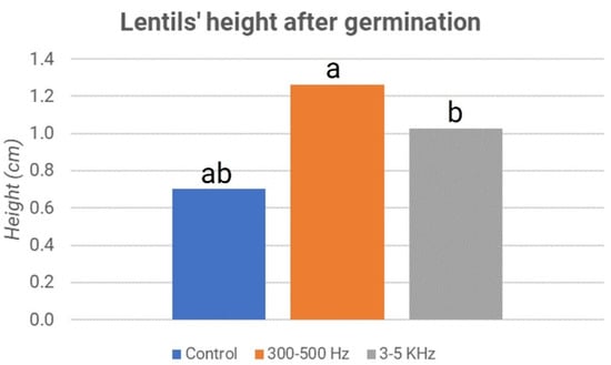 Lentils’ height after germination: third experiment. The letters “a” and “b” refer to the statistical significance of the observed difference between sample couples with a p-value < 0.05 and n = 160.