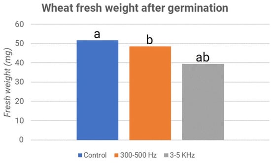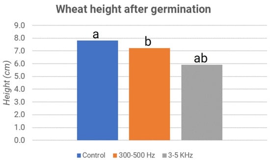 The growth in the height of the shoots was also significantly lower in the treated samples than in the sample control for this case (Figure 12). In addition, regarding the height of the shoots of the three samples, the p-value values show statistically significant differences only between the acoustic treatment with 3–5 kHz waves and the other two samples, i.e., the control and stimulation at 300–500 Hz. The presence of the endosperm in the wheat seeds can represent a brake for the phenomena observed.