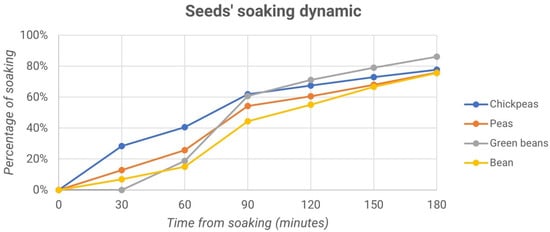 Percentage of soaking vs. time from soaking for chickpeas, peas, green beans and beans.