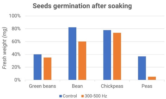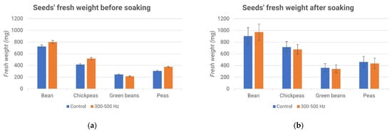 Seed germination after soaking: fresh weight vs. samples (green beans, bean, chickpeas and peas); control (blue) and 300–500 Hz stimulation (orange).