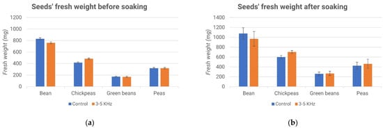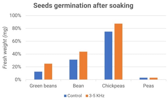 Seed germination after soaking: fresh weight vs. samples (green beans, bean, chickpeas and peas); control (blue) and 3–5 kHz stimulation (orange).