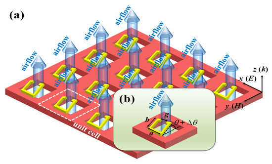To make the LC circuit more flexible, manufacturable and applicable, the micro-electro-mechanical system (MEMS) technique has been demonstrated in the literature [42]. It can independently form an intelligent system, which means it does not need to change the material and external parameters of the metamaterial. In this study, we propose a tunable THz metamaterial using the MEMS technique. This proposed MEMS-based THz metamaterial (MTM) is composed of SRR configuration on the patterned silicon (Si) substrate with through Si via (TSV). SRR configuration is released and suspended on TSV, which can be used for pressure sensing applications [43,44,45,46,47,48]. In the initial state, the influences of electromagnetic responses in transverse magnetic (TM) and transverse electric (TE) modes are investigated to optimize the MTM geometric parameters. Second, the electromagnetic responses are discussed when the airflow passes through the TSV from bottom to up and then bends the SRR cantilever. Therefore, the SRR cantilever will be bent upward in a different extent by increasing the airflow rate. Such a design of the proposed MTM could be applied in the high-efficient pressure and flow rate sensors.