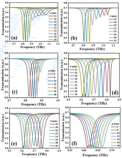 Figure 2 shows the transmission spectra of MTM with different a, b, and g values in TM and TE modes. The transmission spectra of MTM by changing a value from 14 μm to 30 μm in TM and TE modes as shown in Figure 2a,d, respectively, while keeping b and g values as constant as b = 26 μm and g = 12 μm. The resonances are red-shifted from 1.080 THz to 0.810 THz in TM mode and from 0.810 THz to 0.610 THz in TE mode. These trends are quite linear. The resonant spectrum has the strongest response mode and the largest amplitude of resonance in the range of 14 μm to 30 μm. Thus, the optimized a value is defined as 26 μm in this study. Figure 2b,e show the transmission spectra of MTM by changing b value from 16 μm to 30 μm in TM and TE modes, respectively, while keeping a and g values as constant as a = 26 μm and g = 12 μm. The resonances are red-shifted from 1.041 THz to 0.810 THz in TM mode and from 0.760 THz to 0.610 THz in TE mode. These trends are also quite linear. The resonant spectrum has the strongest response mode and the largest amplitude of resonance in the range of 16 μm to 30 μm. The optimized b value is defined as 26 μm in this study. Figure 2c,f show the transmission spectra of MTM by changing g value from 6 μm to 18 μm in TM and TE modes, respectively, while keeping a and b values as constant as a = b = 26 μm. The resonances are blue-shifted from 0.820 THz to 0.890 THz in TM mode and from 0.624 THz to 0.653 THz in TE mode. These trends are also quite linear. The resonant spectrum has the strongest response mode and the largest amplitude of resonance in the range of 6 μm to 18 μm. The optimized g value is defined as 12 μm in this study.