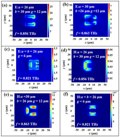 To further investigate the physical mechanism of electromagnetic responses of MTM, the electric (E) field and magnetic (H) field energy distributions of MTM with different a, b, and g parameters in TM and TE modes are plotted in Figure 3 and Figure 4, respectively. Figure 3a illustrates the E-field energy distribution under the conditions of a = 26 μm, b = 30 μm, and g = 12 μm. The resonance is at 0.856 THz. The E-field energy distribution is concentrated on the vertexes of SRR, while the H-field energy distribution is gathered within the inside of SRR as shown in Figure 3d. Thus, there is an induced electric current in the SRR that can be equivalent to an LC oscillation circuit. This induced resonance is called LC resonance. In Figure 3b,e, the SRR parameters are a = 30 μm, b = 26 μm, and g = 12 μm, which can induce three equivalent electric currents focused on the contour of SRR. It is obvious to observe that there is an energy concentration difference from the E- and H-field distributions, which can form a cyclic current inside the SRR. This circuit is composed of three capacitors and one inductor to generate a LC oscillation mode. Figure 3c,f are the E- and H-field distributions of SRR at the resonant frequency of 0.821 THz with a = b = 26 μm and g = 6 μm. The E-field energies are mainly concentrated on the inner corner of the opposite gap and the inside of SRR, while the H-field distribution is gathered in the inner opposite SRR.