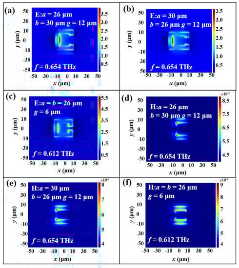 In Figure 4a,d, the physical mechanism of resonances in TE mode is similar to that in TM mode under the conditions of a = 26 μm, b = 30 μm, and g = 12 μm. The observed field energy distributions are mainly concentrated on the inside of SRR and slightly gather within the corner of the opposite gap. The H-field energy distributions are collected in the inside corner of SRR. By changing b value to 26 μm and keeping a = 30 μm and g = 12 μm, the results of equivalent induced electric currents are shown in Figure 4b,e, which are the same equivalent circuit mode as shown in Figure 4a,d, respectively. Figure 4c,f show the results of E-field and H-field energy distributions under the conditions of a = b = 26 μm and g = 6 μm, which show similar electromagnetic characteristics in TM mode. It can be verified that the change of geometric parameters of SRR will cause the resonant frequency shift.
