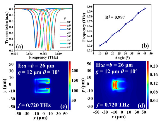 Figure 5a shows the transmission spectra of MTM with different θ values. By increasing the bending degrees of the MTM from 10° to 45°, the resonance will be linearly blue-shifted from 0.721 THz to 0.796 THz with a tuning range of 0.075 THz in TM mode. Figure 5b shows the relationship of θ values and resonances. The resonance shift exhibits a linear tendency regarding to θ variations. The linearity is 0.997. The E- and H-field energy distributions in TM mode with a = b = 26 µm, g = 12 µm and θ = 10° are plotted in Figure 5c,d, respectively. According to the induced electric circuit corresponding to the energy distribution as discussed above, the E-field energy is mainly gathered within the opposite gap and H-field energy is concentrated on the inside surface of SRR. There is an equivalent LC resonant circuit with one capacitor and one inductor induced by an electromagnetic field.