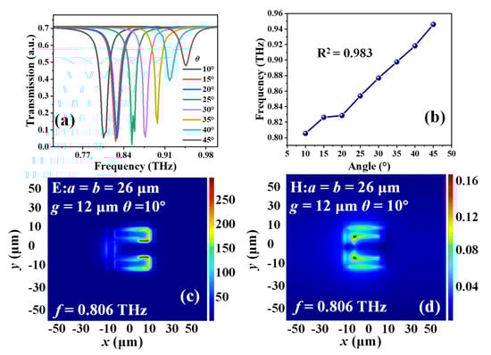 (a) Transmission spectra of MTM with different θ values. (b) Relationship of θ values and resonances. (c) E– and (d) H–field distributions of MTM with a = b = 26 µm, and θ = 10° in TM mode.