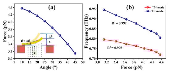 Since the transmission spectra of MTM exhibit an appropriate tendency of θ variation, the magnitude of the equivalent updraft by using the force analysis of the cantilevers and the physical and mathematical models can be calculated distinctly. The model can be regarded as a cantilever with the single-clamped beam. The cantilever can be bent in different angles by an upward airflow passing through the TSV. The rising airflow provides the input pressure that makes the cantilever with a homogeneous force. By utilizing the infinitely subdivided single-clamped beam model into small pieces, conducting force analysis and integration on each small piece of the single-clamped beam. The magnitude of the updraft force can be expressed by F = mgcosθ. Therefore, the force detected by the cantilever can be calculated by the mass equation, e.g., m = ρ·V. The Au material density is 19.32 g/cm3, and the volume can be calculated from the cantilever. Figure 7a shows the relationship between cantilever bending angles and induced bending forces. Owing to the airflow force vertically detected by the MTM cantilever, the MTM cantilever with a smaller bending angle will sustain large airflow upward pressure. Therefore, the MTM cantilever with the smaller bending angle will be detected the increased updraft with a large airflow force. Conversely, when the bending angle of the cantilever becomes large, the contact area of the cantilever by the airflow is smaller, which will cause the detected force smaller. It can be confirmed that the airflow force will result in the resonant frequency shift according to the relationship between the cantilever bending angle and the induced bending forces in Figure 7a, and the relationship between the bending angle and the resonant frequency shift in Figure 5b and Figure 6b, respectively. Figure 7b summarizes the relationships between the resonant frequency and the induced bending force in TM and TE modes. The resonances are red-shifted from 0.796 THz to 0.721 THz with a tuning range of 0.075 THz in TM mode and from 0.945 THz to 0.805 THz with a tuning range of 0.140 THz in TE mode, respectively, by enlarging the induced bending force from 3.1 pN to 4.4 pN. The trends are quite linear with linearities of 0.975 and 0.992 for TM and TE modes, respectively. Additionally, according to the simulation and calculation results, the sensitivity of the MTM device is 0.0591 THz/pN and 0.109 THz/pN for sensing pressure in TM and TE modes, respectively, and 13.727 THz/(m/s)2 and 24.739 THz/(m/s)2 for sensing airflow rate in TM and TE modes, respectively. Such results can appropriately reflect that the MTM design provides an effective approach to detecting the change of the airflow and the induced bending force of MTM and then performing the sensing application.