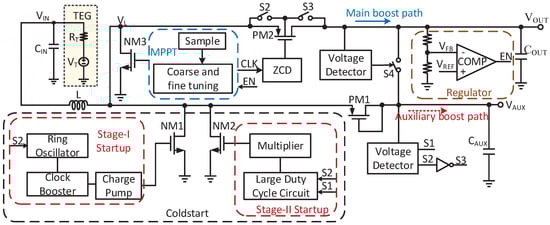 To achieve coldstart, ref. [] uses an off-chip transformer but increases the costs and sizes. The transformer-reuse technique restricts the peak efficiency. A fully integrated startup approach is adopted in [,]. However, the peak efficiency is only 58% and 76%, respectively, due to the improper loss control. Ref. [] achieves a high peak efficiency of 83%, but it only starts from a TEG voltage of 220 mV, which is not low enough. Therefore, it is challenging to achieve a lower voltage startup and high efficiency with only one inductor.