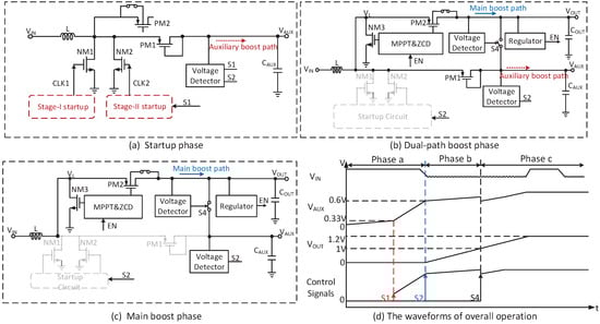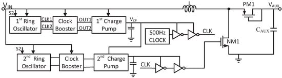 In the dual-path boost phase, the control modules are supplied by . MPPT and ZCD are enabled by S2 to provide the clock for NM3 and PM2, as shown in Figure 2b. However, PM1 is a diode structure which causes a drop-off loss. Once reaches 1 V, and are shortened by .