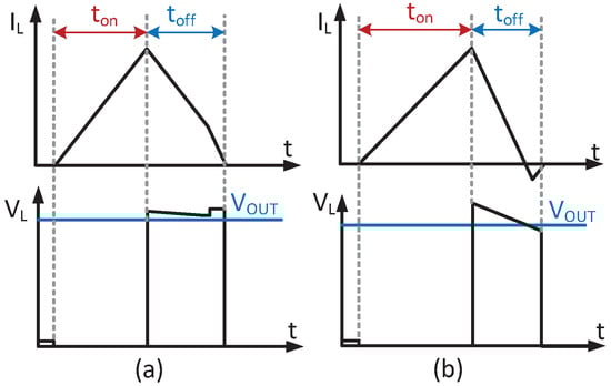 Figure 4 shows the non-ideal delay of the PM2 switch. If the PM2 turns off early, a large overshoot will generate in as shown in Figure 4a, which is a reduction in conversion efficiency. On the contrary, if PM2 turns off late, the output current will reverse to as shown in Figure 4b, which also results in a large loss. Meanwhile, the ideal voltage conversion for the boost converter can be calculated as