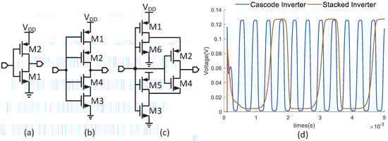 where is the oscillation frequency and is the 3 dB bandwidth of the inverter. A low supply voltage degrades the dc gain and the output swing of the inverter. It needs a lot of inverters, which results in low output frequency. The cascode inverter shown in Figure 6b and stacked inverter [] depicted in Figure 6c can improve the dc gain and the output swing by dynamically reducing the leakage current in the discharging phase. The dc gain of the two inverters can be expressed: