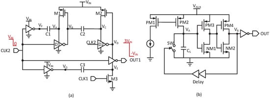 As shown in Figure 7a, the clock booster with a higher amplitude is used to improve the charge–transfer ability. Once CLK2 is high, and step low while and are high. Hence, both C1 and C2 store a voltage of . Contrarily, C1 and C2 are connected in series, and is boosted to . Similarly, since CLK1 is opposite to CLK2, can obtain when CLK2 is high. In this way, the clock amplitude is boosted to . However, due to the loss and leakage current, the practical swing is smaller than .