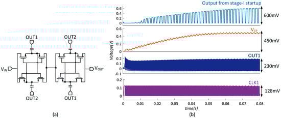 (a) The structure of each charge pump; (b) stage-I startup simulation waveform when = 128 mV.
