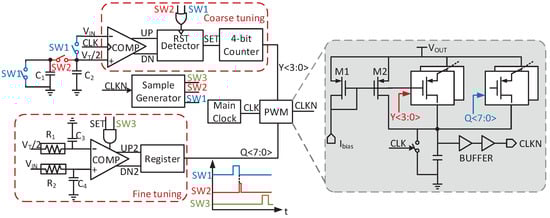 A small change of may decrease the boost ratio. To overcome these shortages, a fine-coarse tuning is proposed in this design, as shown in Figure 3. In this structure, can be expressed as