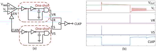 The schematic of ZCD is shown in Figure 10a. It is composed of two one-shot circuits, a RS flip-flop and a static high-precision comparator from []. The voltages and are sensed by the comparator per cycle to detect the inductor current direction. Once the difference of two voltage-nodes decreases to 0, the HS switch is turned off immediately. According to Section 3, a proper dead time is needed and realized by the below one-shot circuit. For quickly and accurately tracking, the comparator consumes 6 A quiescent current. Hence, the comparator is only enabled within the off-time of NM3 to reduce the average power consumption.