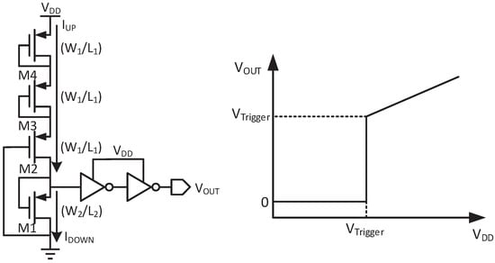 The voltage detector with its waveform is shown in Figure 11. When reaches , turns high. The trigger voltage is determined by comparing and . To reduce the power consumption, M1-M4 are working in the subthreshold region. According to [], is expressed as