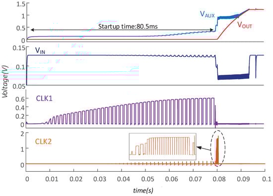 In stage-I startup, the two charge pumps are driven by the clocks OUT1 and OUT2 from the clock boosters, which is shown in Figure 8a. If the loss and load are zero, each charge pump could produce an output voltage at 9 times of . However, at a low supply, due to the poor clock driving capacity and the leakage current, the charge pump generates a lower boost ratio. Figure 8b shows the simulated results of stage-I startup. The 1st charge pump is driven to charge up to 450 mV with a 100 pA load. The boost ratio is limited to 3.5. Meanwhile, the boost ratio of the 2nd charge pump is limited to 1.5 with a 50 pA load. The efficiency of each charge pump is 4%. Finally, a clock with a 600 mV output swing is obtained.