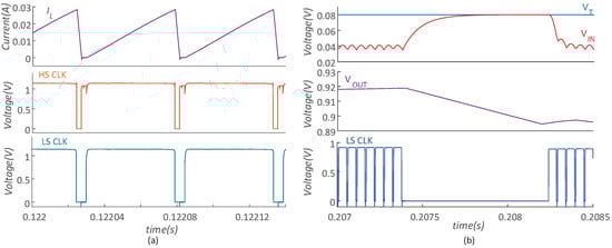 Figure 13a shows the simulated results of the main clock and inductor current with 128 mV . The frequency is 18.5 kHz and the on-time of LS is about 40 s. Besides, the peak inductor current is 28 mA. The results show a negligible leakage in , which indicates the proper current detection under a relatively heavy load condition with = 600 A. Figure 13b shows the sample phase in 80 mV with a 300 A output current. Both LS and HS turn off, and thus, can be sampled. The sample time is 1 ms and decreases by 30 mV, which results in only 0.02% efficiency reduction in a sample period.