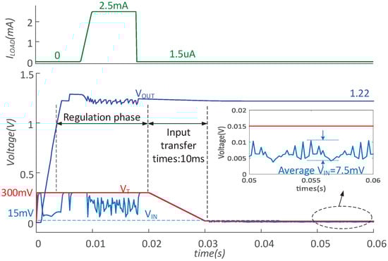 Figure 14 shows the system operation with MPPT when changes from 300 mV to 15 mV. During 10∼20 ms, the converter works intermittently at the open-circuit voltage of 300 mV, providing 2.5 mA output. After a 10 ms transition, the converter works with 15 mV , providing 1.5 A output. During 50∼60 ms, decreases to only 15 mV, while the minimum input voltage of proposed converter is about 7.5 mV, which also means that the proposed MPPT still can efficiently work.
