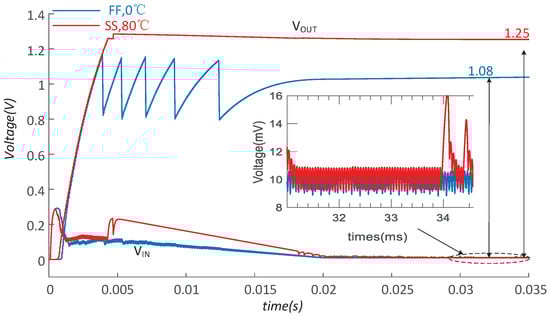 To verify the sensitivity of the proposed circuit to the process as well as temperature variations, and predict the performance after fabrication, the simulations with temperature ranging from 0 to 80 °C and different corners are carried out. Figure 15 shows the simulated output in FF corner at 0 °C and SS corner at 80 °C. The converter can normally work when changes from 300 mV to 20 mV and finally provides a 1.08 V and 1.25 V regulated output voltage, respectively. In the tracking phase, the input voltage is about 10 mV, which indicates that the proposed MPPT can also efficiently and accurately work in different corners. Table 1 shows that the startup voltage increases to 130 mV in corner FF and 160 mV in the SS corner.