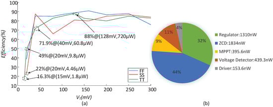 (a) The conversion efficiency and key output power in different corners in 27 °C; (b) the power consumption of each module.