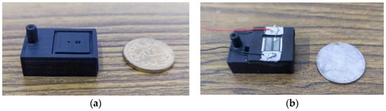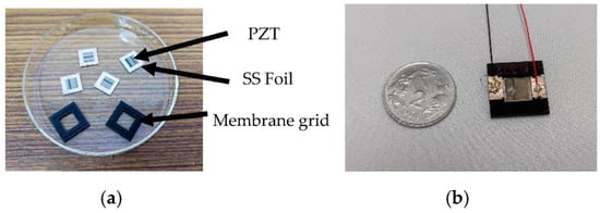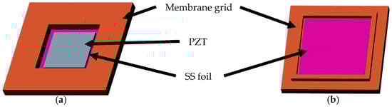Figure 4a shows the PZT-mounted composite membrane and the 3D-printed grids. Figure 4b shows the assembled membrane with the electrical contacts for actuating the membrane. The polymer grid is printed on a 3D printer (Figure 4 Standalone, 3D Systems, Rock Hill, SC, USA). Pro-BLK 10 bio-compatible photopolymer was chosen for its superior mechanical properties, low cost, bio-compatibility and its ability to create high resolution prints repeatably. An SS 304 stainless steel foil having an average thickness of 30 μm is cut into 13 mm × 13 mm pieces using a laser cutter. The PZT 5H-4E plates of 8 mm × 8 mm having a thickness of 127 μm are bonded to one side of the cleaned SS foil using a 2-part silver conductive epoxy from MG Chemicals (MG Chem 8331-14G, Ontario, Canada). This ensures that the membrane can be used as one of the terminals of the PZT. Silver paint (RS Pro Conductive Lacquer 186-3600, RS Pro, Corby, UK) is used to create an electrical connection from the membrane to the top surface of the plastic grid, to which a wire is bonded using the conductive epoxy. To bond the membrane PZT composite stack to the plastic grid in the seat provided on the polymer grid, a 2-part clear epoxy (Araldite Klear. Pidilite Industries Limited, Mumbai, India) is used.