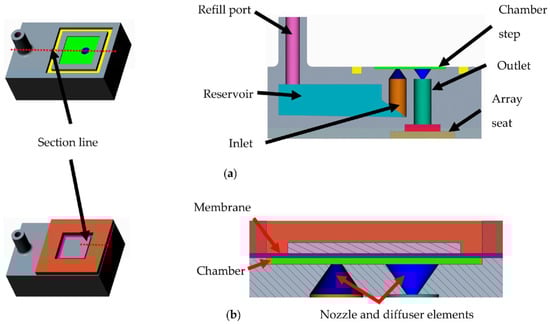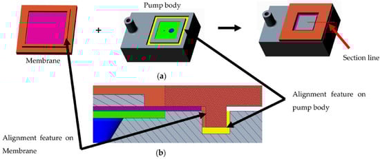 Previous work [,] has shown that the ratio of the lengths of PZT and membrane should be 0.85 in order to achieve the highest membrane deflection. Hence, a commercially available PZT plate of 8 mm × 8 mm is chosen to create the composite actuator. The PZT element is bonded onto the SS 304 foil to create a composite actuator, as shown in the computer-aided design (CAD) model in Figure 2. This composite structure is then attached to a 3D-printed grid. The grid is designed such that it allows precise alignment of the foil–PZT composite with it. This assembled structure also has alignment features to enable self-alignment of the membrane component with the pump chamber. The cross-sectional CAD model in Figure 3a shows how the composite membrane integrates with the fluid region. Figure 3b shows the zoomed view of the cross-section showing different regions of the pump along with the feature that aids self-alignment.