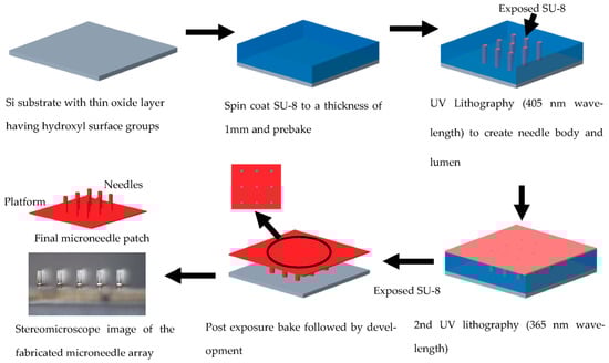 The substrate is then subjected to a post exposure bake for 3 h at 90 °C (1 h) with gradual ramping of temperature. Then, the substrate is developed in an SU-8 developer with ultrasonication for 30 min. At the end of the development, the microneedle arrays separate from the substrate and are collected and dried. Finally, an array of polymer microneedle monolithically integrated with a platform is obtained.