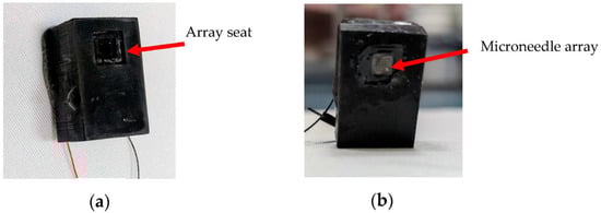 The microneedle array and the micropump with the integrated reservoir need to be assembled to create the final transdermal delivery platform. The design of the fluid region of the micropump is made such that the needle array can be fixed to the underside of the pump body. This allows the platform of the array to sit flush with the pump bottom allowing the needles to protrude out of the component. As mentioned earlier, this design reduces the siphon effect usually seen in valveless pumps with large chamber heights by reducing the height difference between the inlet and the outlet. A 2-part clear epoxy (Araldite Klear) is, again, used to bond the fabricated microneedle array to the needle seat (Figure 8a) on the underside of the assembled pump, as seen in Figure 8b. The fabricated components are subjected to mechanical and fluidic characterizations to analyze their performance. Table 1 shows the important geometrical and material parameters of the designed system. The following section discusses the various experiments conducted on the fabricated components.