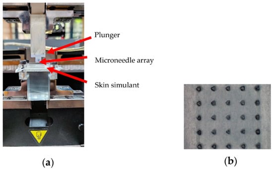 Insertion tests are carried out using the fabricated microneedle arrays to determine if they could penetrate the skin. The needles are required to penetrate deep into the epidermis, which has a thickness between 100 and 200 μm [,]. As the mechanical properties of human skin vary from person to person and even at different regions of the body, a skin simulant was chosen for the tests. Parafilm-M, a commerically available laboratory film, has been shown to be an effective skin simulant for testing microneedle insertion capabilities [,] (Amcor, Zurich, Switzerland). Parafilm-M, having a thickness of 125 μm, is folded 8 times onto itself creating a testing film of approximately 1 mm thick. An expanded polyethylene layer is placed below the testing membrane and serves the purpose of simulating the muscle backing below the skin. A jig is designed and fabricated inhouse to hold the testing film while the needles attached to a plunger press the needles against the testing membrane. A micro tensile tester (Instron UTS 5948, Norwood, MA, USA) is used to carry out the testing, and the setup is shown in Figure 9a. The needles are plunged into the test film at a rate of 5 mm/min and, once a pre-determined force is reached, it is held pressed against the membrane at this force for 30 s. The needle array is then pulled away from the parafilm at a rate of 10 mm/min. Sudan black dye is applied on the parafilm after the test to help analyze if a layer has been penetrated by observing the dyed film under a microscope. A mark on one layer indicates that the previous layer has been penetrated, as seen in Figure 9b. This gives an approximate value for the penetration depth of the needle array.