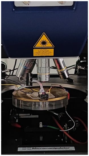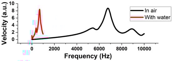 The fundamental resonance frequency of the membrane with air and water as the working medium is measured. The displacement of the membrane and, hence, the performance of the pump is the maximum when the pump membrane is actuated at its fundamental frequency []. The fundamental frequency depends on the working medium. Hence, vibrational analysis was performed for the micropump with air and water as the working medium using a laser doppler vibrometer (Polytec MSA-500, Polytec Holding AG, Hörsching, Austria). Figure 10 shows the experimental setup. For water as the working medium, a silicone tube is connected to the reservoir inlet. Once the pump is primed with water, the tube is clipped. This ensures that the water does not flow out during measurements. The pump is excited with an 8 V periodic chirp signal, and a fast Fourier transform of the captured velocity data is used to identify the frequencies at which the pump membrane resonates.