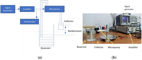 (a) Schematic of the experimental setup. (b) The experimental setup used to measure the performance of the micropump.