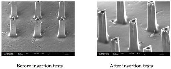 The skin penetration experiments carried out, as described in the previous section, showed that the needles are capable of penetrating 2 layers out of the 8 layers of parafilm used in the test. The penetration depth achieved corresponds to a thickness of approximately 250 μm, which satisfies the requirements for transdermal drug delivery. The average force over 3 trials required to achieve this is found to be 53.33 N for an array of 25 needles. When pressed against the parafilm layers, the needles fail when the force applied on the array was 90 N, which is well over the force required for insertion. It is to be noted that the failure load in compression presented in Section 2.2.1 is for the case where the needles are pressed against a rigid surface. It has been shown that the loads the needles can withstand significantly differ between the cases where the needle is pressed against a rigid material versus a soft material such as skin []. SEM images of the microneedle, as seen in Figure 12, taken before and after the skin penetration tests show no damage to the needles from repeated insertions.