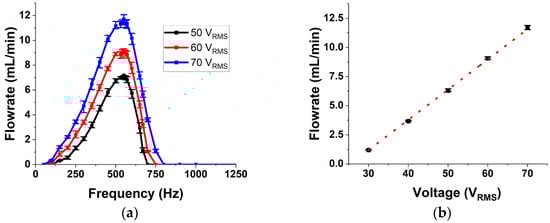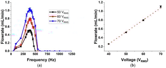 Next, the behavior of the micropump at different operational voltages is presented in Figure 14b, which shows the variation of flowrate with voltage when the pump is operated at its PPF. This shows a linear relation between the applied voltage and the net flowrate produced by the pump. As the applied voltage increases, the membrane displacement increases linearly, thereby increasing the stroke volume. This in turn causes an increase in the flowrate.