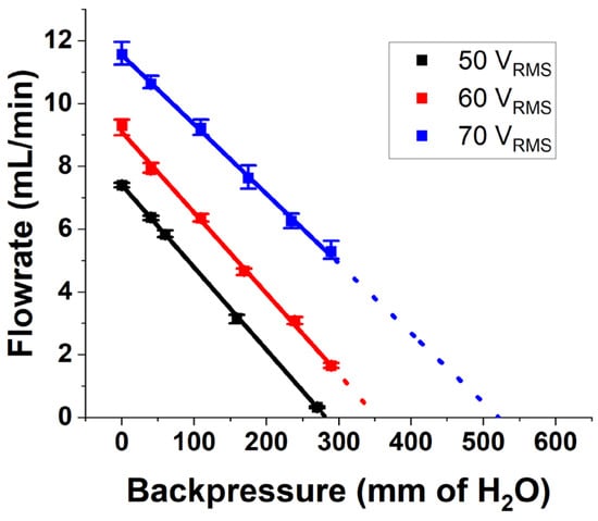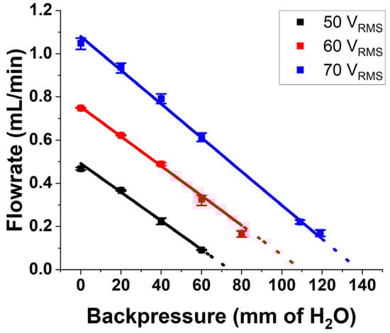 Another important parameter of the pump is its ability to pump against an adverse pressure at the outlet, also called the backpressure. Till now, the pump characteristics were measured when the pressure at the outlet of the pump was atmospheric pressure. In an application scenario, the micropump should deliver the drug against the pressure applied by the skin tissue. Figure 15 shows the flow rate from the pump at different backpressures when the pump is operated at its PPF and 3 operational voltages of 50, 60 and 70 VRMS. The graph shows a linear variation of flowrate with backpressure, which is a characteristic of valveless pumps reported in the literature [,,]. It is seen that the maximum backpressure (backpressure at zero flow) obtained by extrapolating the experimental data when the pump is operated at 70 VRMS and 550 Hz frequency is 5.15 kPa with a power draw of 400 mW. Hence, the pressure supplied by the pump is sufficient to overcome the tissue pressure of 400 Pa. A maximum flow rate (at zero backpressure) of 11.7 mL/min and the maximum backpressure (a zero flow) of 5.15 kPa at a low power of 400 mW are the important performance parameters of the fabricated pump when operated at 70 VRMS and 550 Hz.