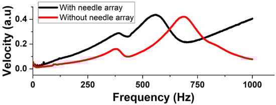 Comparison of membrane resonance with (in red) and without (in black) a microneedle array attached to the micropump.