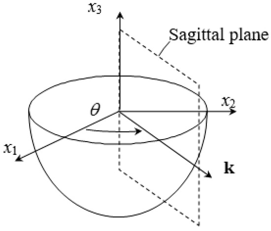 Alongside Rayleigh SAWs, SAWs also include transversely polarized horizontal transverse SAWs, also known as Love waves. Therefore, additional restrictions must be added to distinguish these. Figure 1 shows that the propagation directions of the SAWs discussed in this study fall on the quasi-isotropic plane of the layered substrate. The Rayleigh waves only contain the in-plane displacement of the sagittal plane and no out-of-plane displacements. When the wave propagation direction is , its displacement vector can be rewritten as follows: