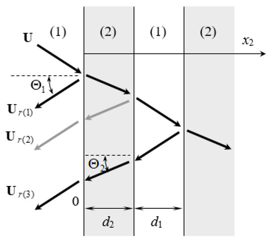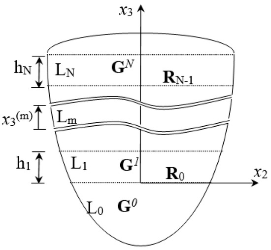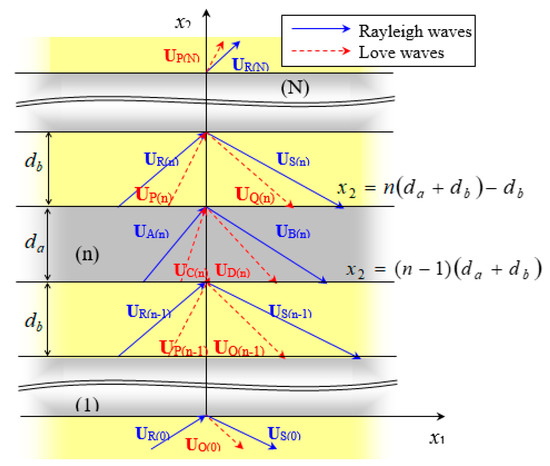 where the superscript m represents the substrate Lm of thickness hm, and . L0 is the base material with a semi-infinite field; Gm is substrate Lm‘s impedance tensor. Rm is the mth layer interface’s reflection coefficient tensor, and is the acoustic wave’s local impedance transmitted up and down the mth layer substrate.