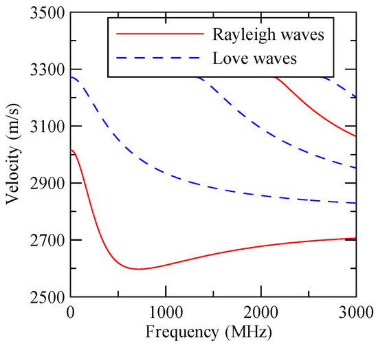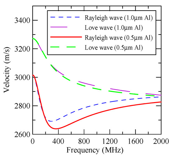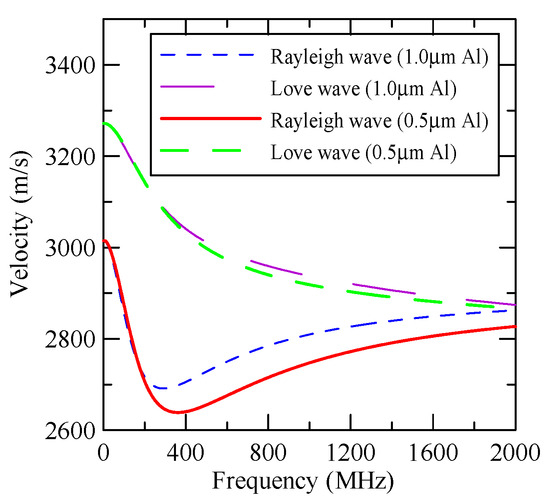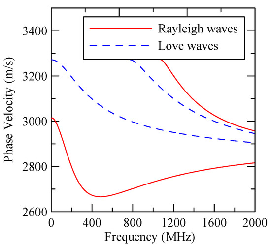 As the layered semi-infinite field’s upper surface is a free boundary and the electrical boundary is open, the layered substrate is 0.5 mm thick aluminum and 1 mm thick zinc oxide. Furthermore, the thickness of the glass substrate is 1.1 mm. Substituting each parameter into the dispersion relation equation obtains the dispersion curves for ZnO/Glass and Al/ZnO/Glass, which are shown in Figure 5 and Figure 6, respectively. The solid line in the figure represents the Rayleigh wave’s phase velocity, while the dashed line represents the Love wave’s phase velocity. The SAW dispersion curves shown in Figure 7 and Figure 8 demonstrate that the thickness of zinc oxide is 1.5 mm.